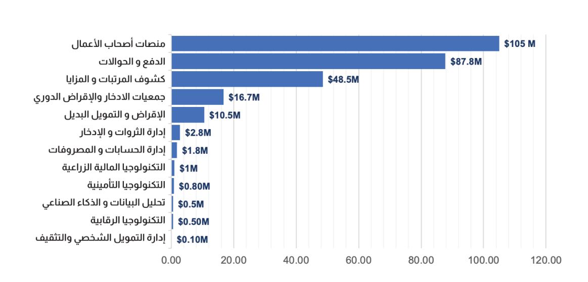 وأشارت الدراسة إلى أنه خلال الخمس سنوات الماضية تم توجيه معظم الاستثمارات في قطاع التكنولوجيا المالية إلى منصات أصحاب الأعمال B2B MarketPlace، تليها المدفوعات والتحويلات، ثم الرواتب والمزايا، ثم جمعيات الإدخار والإقراض الدوار.