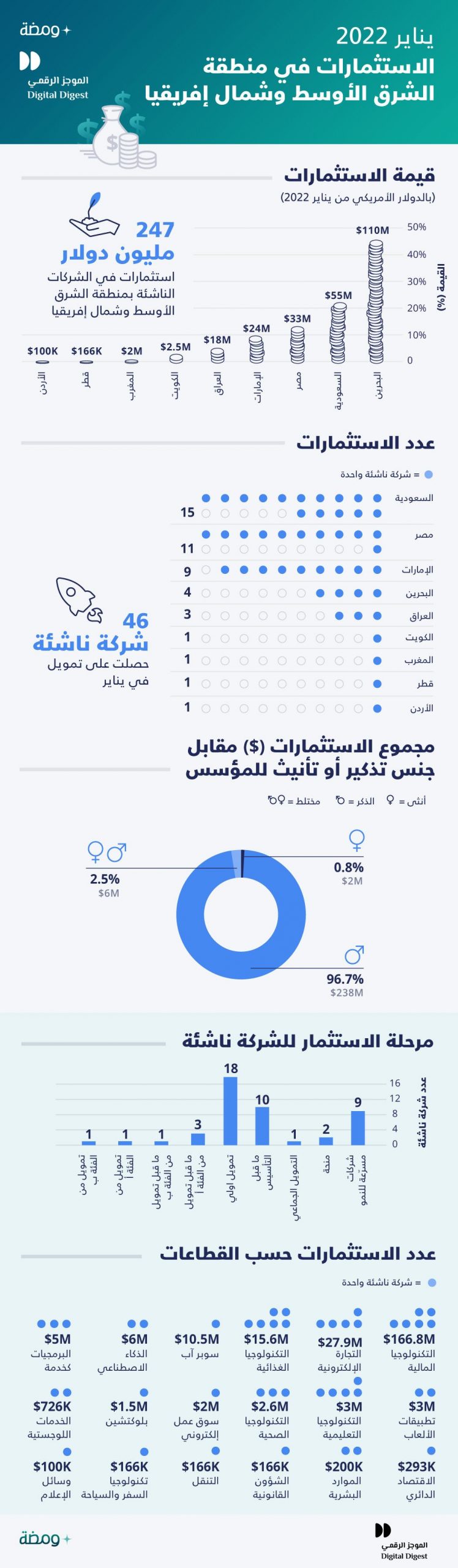 ارتفعت الاستثمارات في الشركات الناشئة بمنطقة الشرق الأوسط وشمال أفريقيا لتسجل 247 مليون دولار في يناير 2022 بزيادة نسبتها 20% مقارنة بالشهر الماضي، وبزيادة 474% مقارنة بالشهر ذاته من العام الماضي، وبلغت عدد الصفقات 46 صفقة، وفقًا لتقرير صادر عن ومضة والموجز الرقمي.