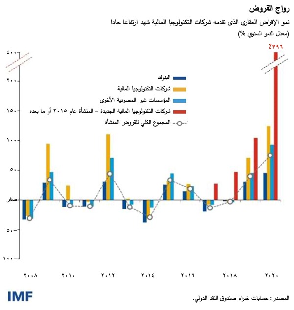 وتؤدي هذه التغيرات كذلك إلى رفع مستوى المخاطر بالنسبة للأجهزة التنظيمية والرقابية – ذلك أن فرادى شركات التكنولوجيا المالية لا يزال معظمها صغير الحجم، غير أن بإمكانها التوسع بسرعة فائقة عبر عملاء وشرائح أعمال أكثر خطرا من المقرضين التقليديين.