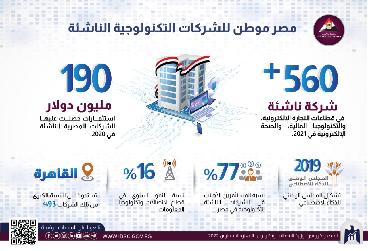تشهد مصر نموًا سريعًا وملحوظًا في الابتكار الرقمي في مجال الاتصالات وتكنولوجيا المعلومات، بالتزامن مع نجاح منظومة ريادة الأعمال في مصر وازدهارها بشكل كبير؛ حيث استحوذت الشركات التكنولوجية المصرية الناشئة على أكبر عدد من الصفقات الاستثمارية بقارة إفريقيا خلال عام 2020.ولذا استعرض الإنفوجرافيك تطور وضع الشركات التكنولوجية الناشئة في مصر في الآونة الأخيرة؛ حيث أوضح تقرير جديد صادر عن شركة “كورسيرا”، إلى وصول عدد الشركات الناشئة في مصر خلال عام 2021 إلى أكثر من 560 شركة ناشئة في قطاعات التجارة الإلكترونية، والتكنولوجيا المالية، والصحة الإلكترونية.