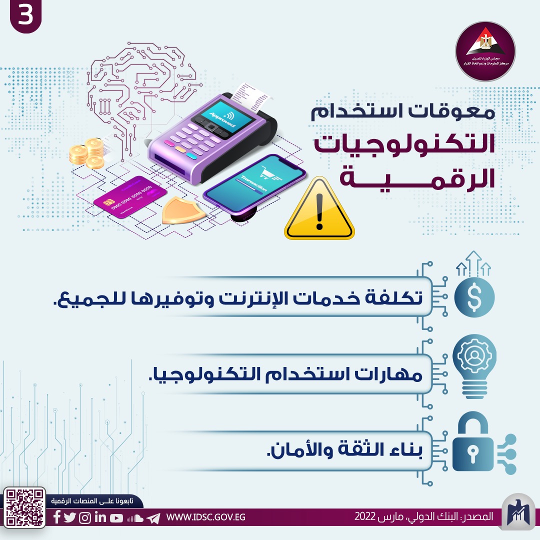 نشر مركز المعلومات ودعم اتخاذ القرار إنفوجرافيك جديدًا يرصد خلاله أبرز النقاط التي تناولها البنك الدولي في تحليله لحالة التكنولوجية الرقمية عالميًّا وفي الدول النامية، إذ رغم ارتفاع عدد مستخدمي التكنولوجية الرقمية إلى 5 مليارات مستخدم عالميًّا، فإنه لا يزال 3 ملايين مستخدم غير متصلين بشبكة الإنترنت، ويعيش 96% منهم في الدول النامية، كما لوحظ زيادة 39% في عدد المستفيدين في الدول التي تطبق نظام المدفوعات الحكومية.