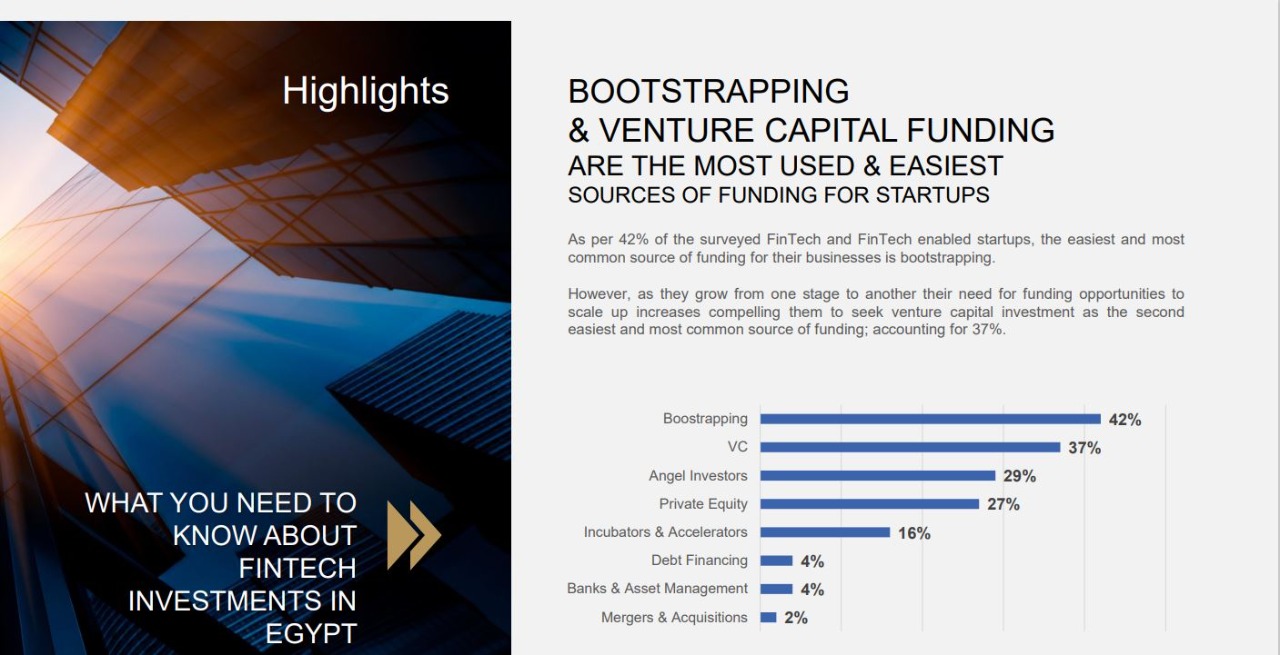 كشف تقرير فنتك إيجيبت التابعة للبنك المركزي، حول الاستثمار في الشركات الناشئة في مجال التكنولوجيا المالية في مصر، والقطاعات المغذية لها، أن 42% من الشركات لم تحصل على تمويلات في الفترة الأولى من بداية العمل، واعتمدت على المصادر الشخصية أو العائلية للتمويل.وجاءت المصادر العائلية أو الشخصية في المرتبة الأولى بنسبة 42% من الاستثمارات التي تم ضخها، بينما جاءت صناديق رأس المال المخاطر في المرتبة الثانية بنسبة 37%، والمستثمرين الملائكيين في المرتبة الثالثة بنسبة 29%، والأسهم الخاصة Private Equity في المرتبة الرابعة بنسبة 27%، وحاضنات ومسرعات الأعمال في المرتبة الخامسة بنسبة 16%، والتمويل بالاقتراض Debt Financing في المرتبة السادسة 4%، والبنوك وإدارة الأصول 4%، وعمليات الاستحواذات والاندماجات 2%.