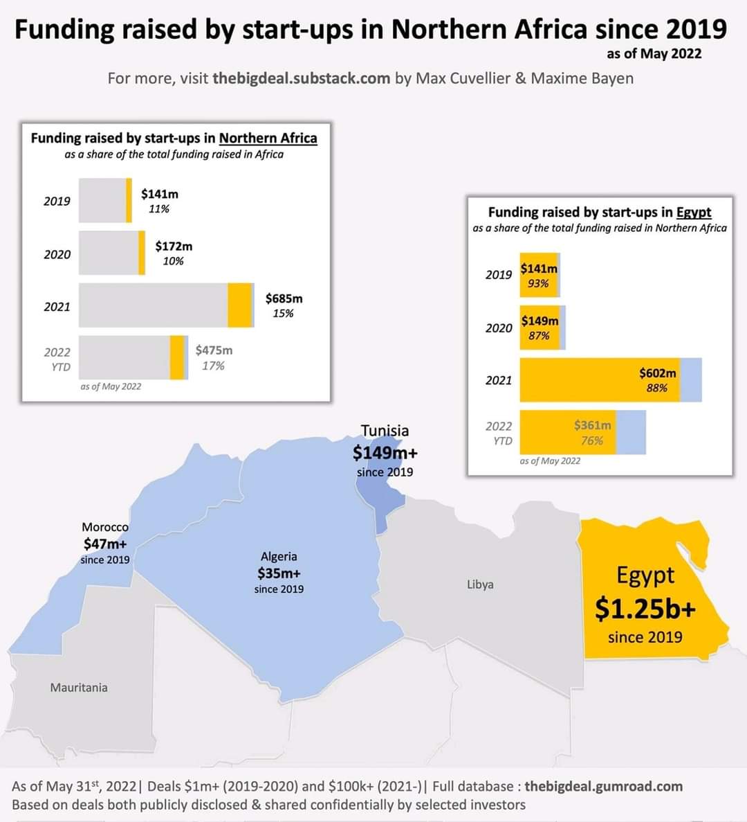 كشف تقرير صادر عن thebigdeal أن الاستثمارات التي جذبتها الشركات الناشئة في مصر منذ عام 2019 حتى شهر مايو الماضي بلغت نحو 1.25 مليار دولار، ما جعلها تتصدر دول منطقة شمال أفريقيا .وأوضح التقرير الذي حصلت عليه “Fintech Gate”، أن حجم الاستثمارات في منطقة شمال أفريقيا خلال نفس الفترة سجلت نحو 1.5 مليار دولار، وبذلك تستحوذ الشركات الناشئة في مصر على نحو 83% من استثمارات منطقة شمال أفريقيا.