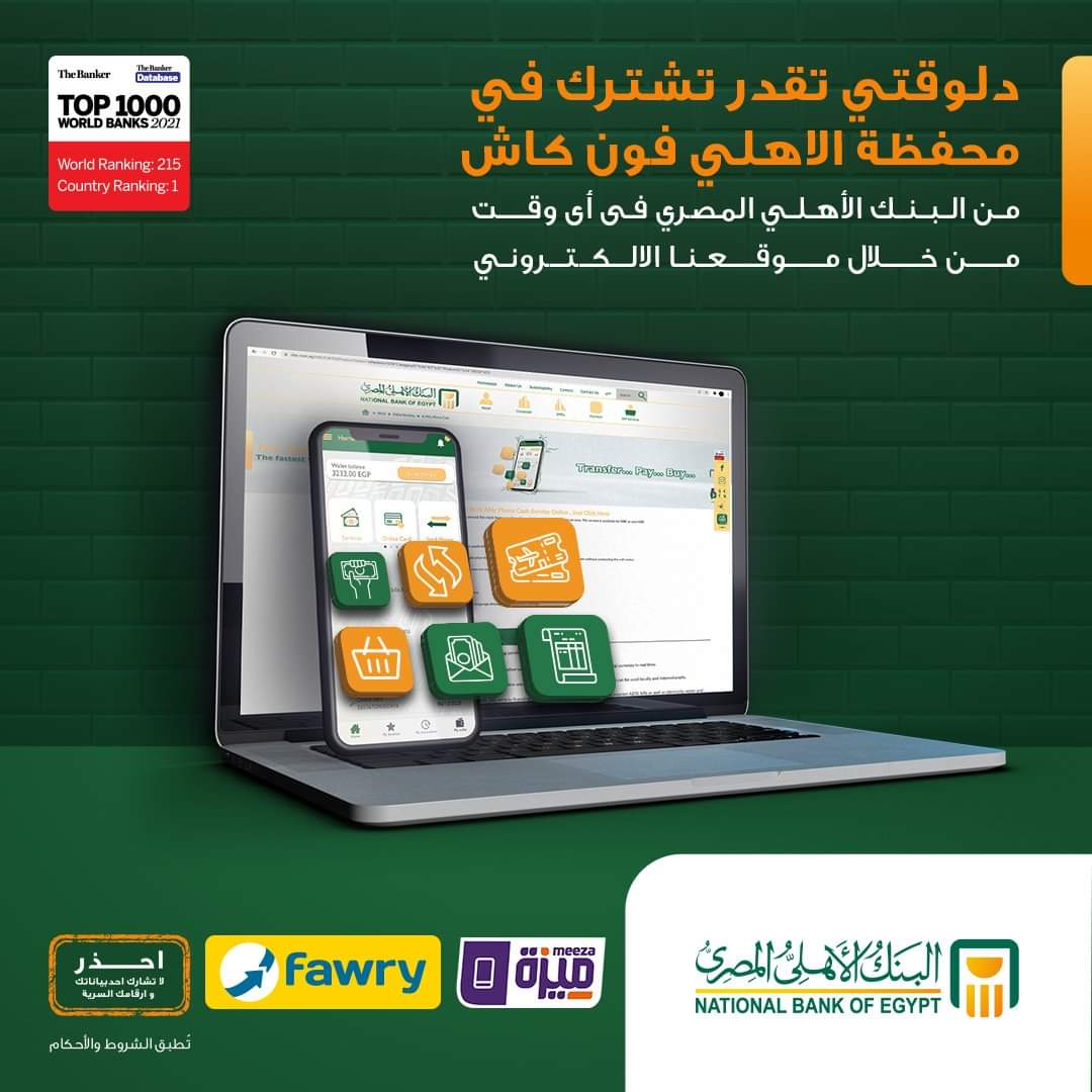 أعلن البنك الأهلي المصري عن إمكانية قيام العملاء بالاشتراك في محفظة الأهلي فون كاش .