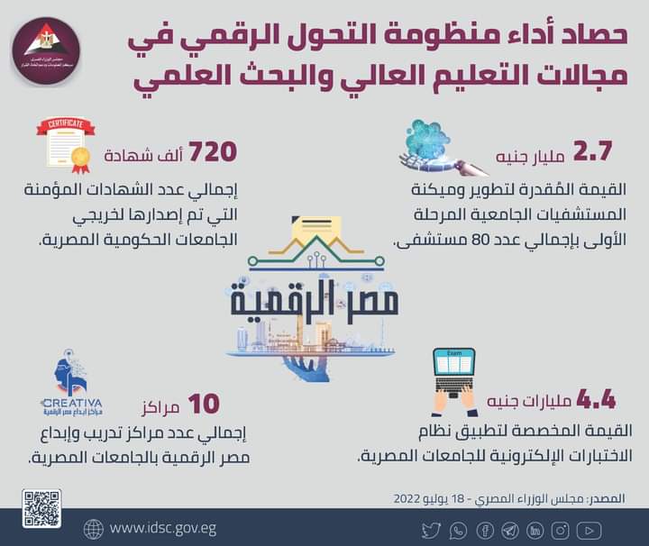 وتناول التقرير إنجازات مشروعات التحول الرقمي، ومنها إصدار ما يزيد على 720 ألف شهادة مؤمنة لخريجي الجامعات الحكومية المصرية، وإنشاء عدد 10 “مراكز تدريب وإبداع مصر الرقمية” بالجامعات المصرية، بالإضافة إلى إطلاق أول هاكاثون للمدن الذكية بالتعاون مع جامعة بنها وشركة أمازون بعنوان (نحو عاصمة إدارية جديدة ذكية).