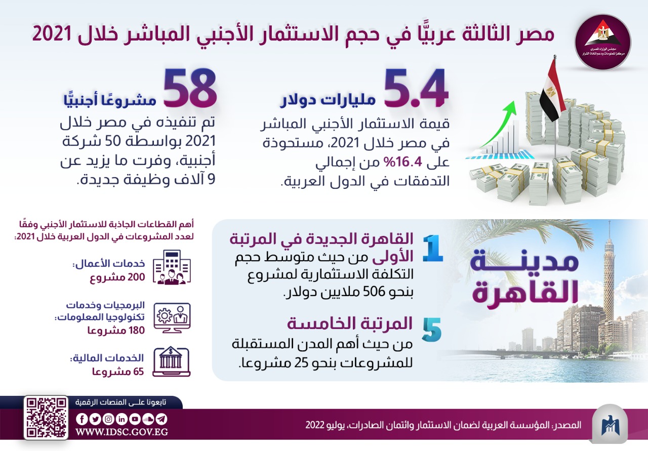 ذكر مركز المعلومات ودعم اتخاذ القرار بمجلس الوزراء أن مصر جاءت في المرتبة الثالثة على المستوى العربي في حجم تدفقات الاستثمار الأجنبي المباشر وذلك بنحو 5.4 مليار دولار لتستحوذ بذلك على 16.4% من إجمالي التدفقات الاستثمارية في المنطقة العربية خلال 2021.