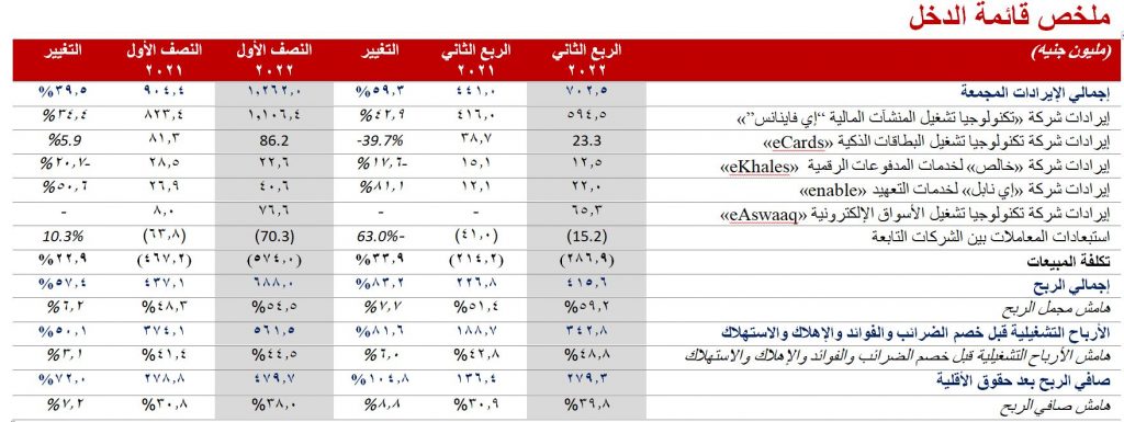 بينما تراجعت إيرادات شركة تكنولوجيا تشغيل البطاقات الذكية «e-Cards» (بعد الاستبعادات) بمعدل سنوي 6.5 % لتسجل 51 مليون جنيه خلال النصف الأول من عام 2022، مقابل 54.5 مليون جنيه خلال نفس الفترة من العام الماضي.