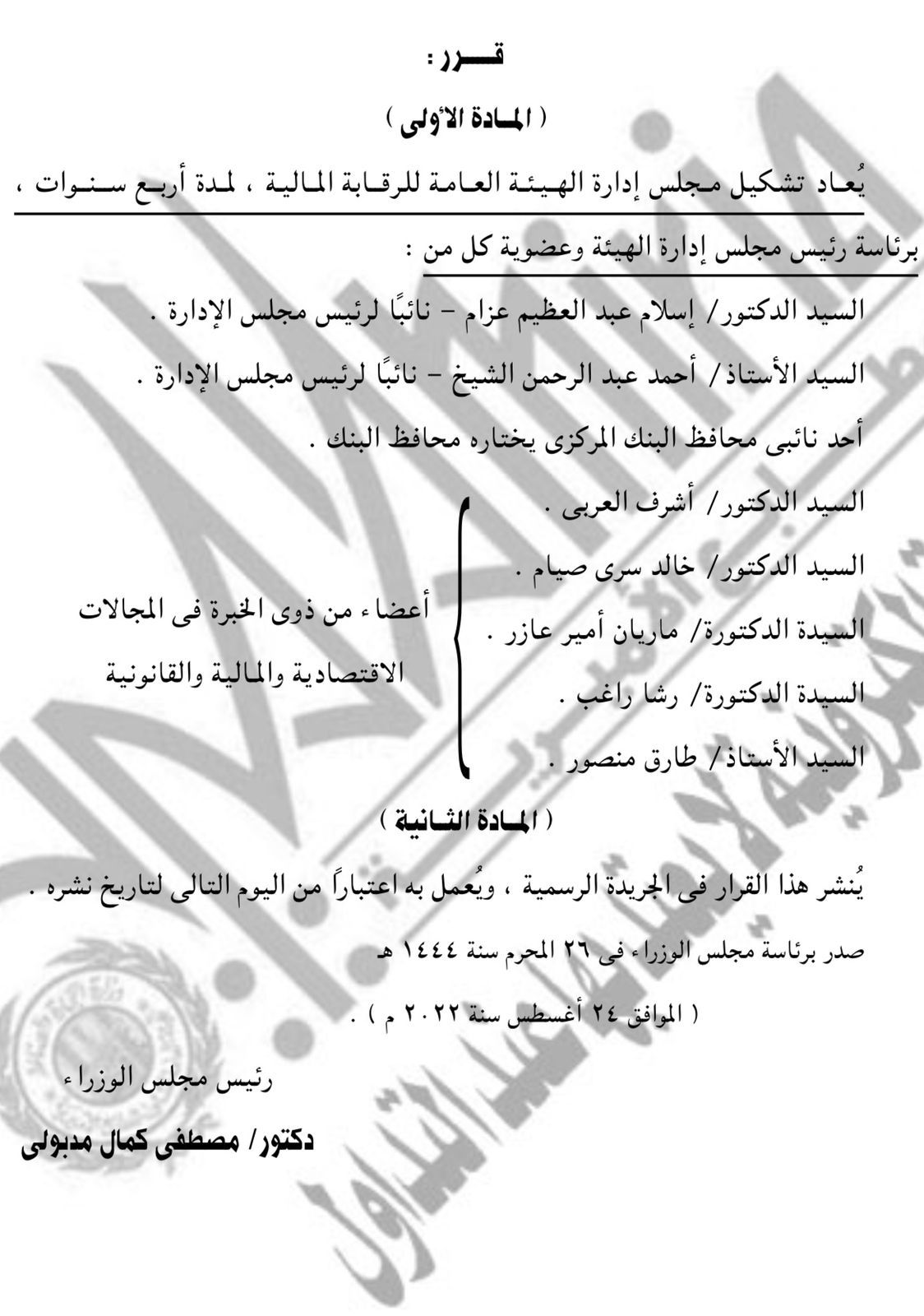 ونص القرار على تشكيل مجلس إدارة الهيئة والذي يضم الدكتور إسلام عبد العظيم عزام – نائبا لرئيس مجلس الإدارة ،و أحمد عبد الرحمن الشيخ – نائبا لرئيس مجلس الإدارة .