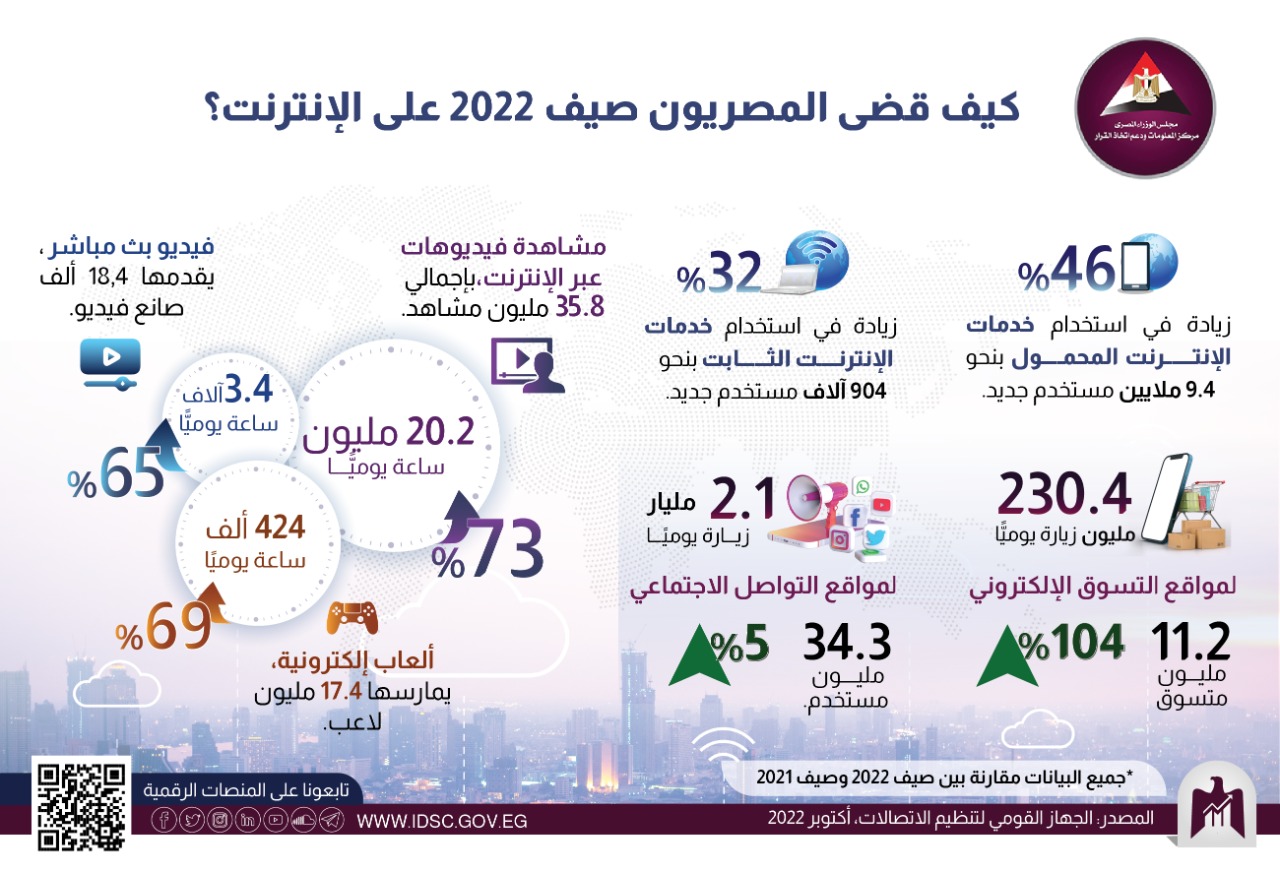 نشر مركز المعلومات ودعم اتخاذ القرار بمجلس الوزراء إنفوجرافيك جديدًا، يرصد خلاله تطور سلوكيات المصريين على الإنترنت وكيفية قضاء أوقاتهم، وفق بيانات الجهاز القومي لتنظيم الاتصالات في أكتوبر 2022، حول مؤشرات استخدام تطبيقات الإنترنت خلال 24 ساعة في صيف 2022، ومقارنتها بالفترة نفسها من صيف 2021.فوفقًا للبيان، لقد ارتفع عدد مستخدمي خدمات الإنترنت المحمول بنحو 46% بما يعادل 9.4 ملايين مستخدم جديد، كما ارتفع عدد مستخدمي خدمات الإنترنت الثابت بنحو 32% بما يعادل 904 آلاف مستخدم جديد.