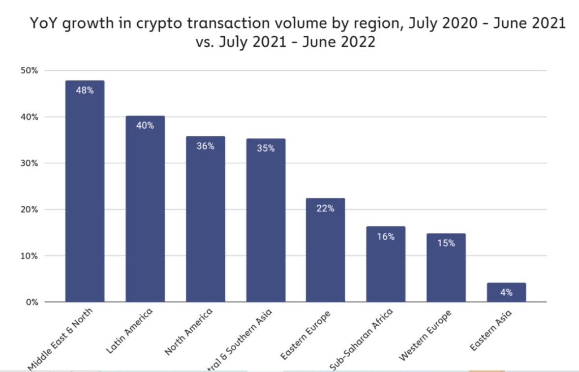 وأوضح المؤشر أن منطقة الشرق الأوسط وشمال إفريقيا تعد واحدة من أصغر أسواق العملات المشفرة وفقًا لمؤشر تبني العملات المشفرة العالمي لكنها مازالت واحدة من أسرع الأسواق نموًا حيث تداول العملاء بالمنطقة حوالي 566 مليار دولار من يوليو 2021-يونيو 2022 بزيادة 48% عن نفس الفترة من العام السابق.
