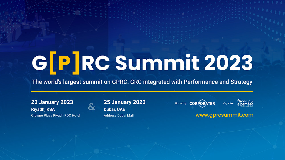تستضيف دبي، قمة الحوكمة والأداء والمخاطر والامتثال GPRC 2023، في 25 يناير 2023، بمشاركة أكثر من 100 من المؤسسات الحكومية والخاصة ونخبة من الرؤساء التنفيذيين والمتخصصين وصناع القرار في مجال الحوكمة والمخاطر والامتثال، بهدف تسليط الضوء على موضوعات التكنولوجيا والتوجهات الرئيسية التي تشكل مستقبل إدارة المؤسسات.