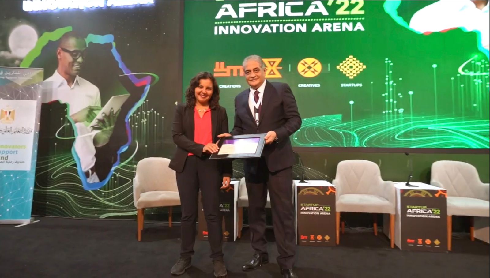 وسلم أسامة كمال الرئيس التنفيذي لشركة تريد فيرز انترناشونال المنظمة لـ Cairo ICT ، جائزة التكريم للدكتورة هبه لبيب التي تشغل منصب مدير مركز الإبتكار وريادة الاعمال والتنافسية بجامعة النيل الأهلية منذ 2017.