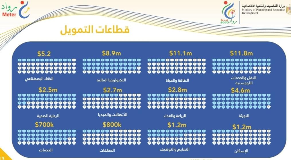 وبلغ حجم التمويلات للشركات الناشئة العاملة في مجال”الخدمات” بنحو 700 ألف دولار، فيما حصلت شركات”المخلفات” على نحو 800 ألف دولار وشركات”التعليم والتوظيف ” على 1.2 مليون دولار، فيما حصلت الشركات الناشئة في مجال “الاسكان” على نحو 1.2 مليون دولار