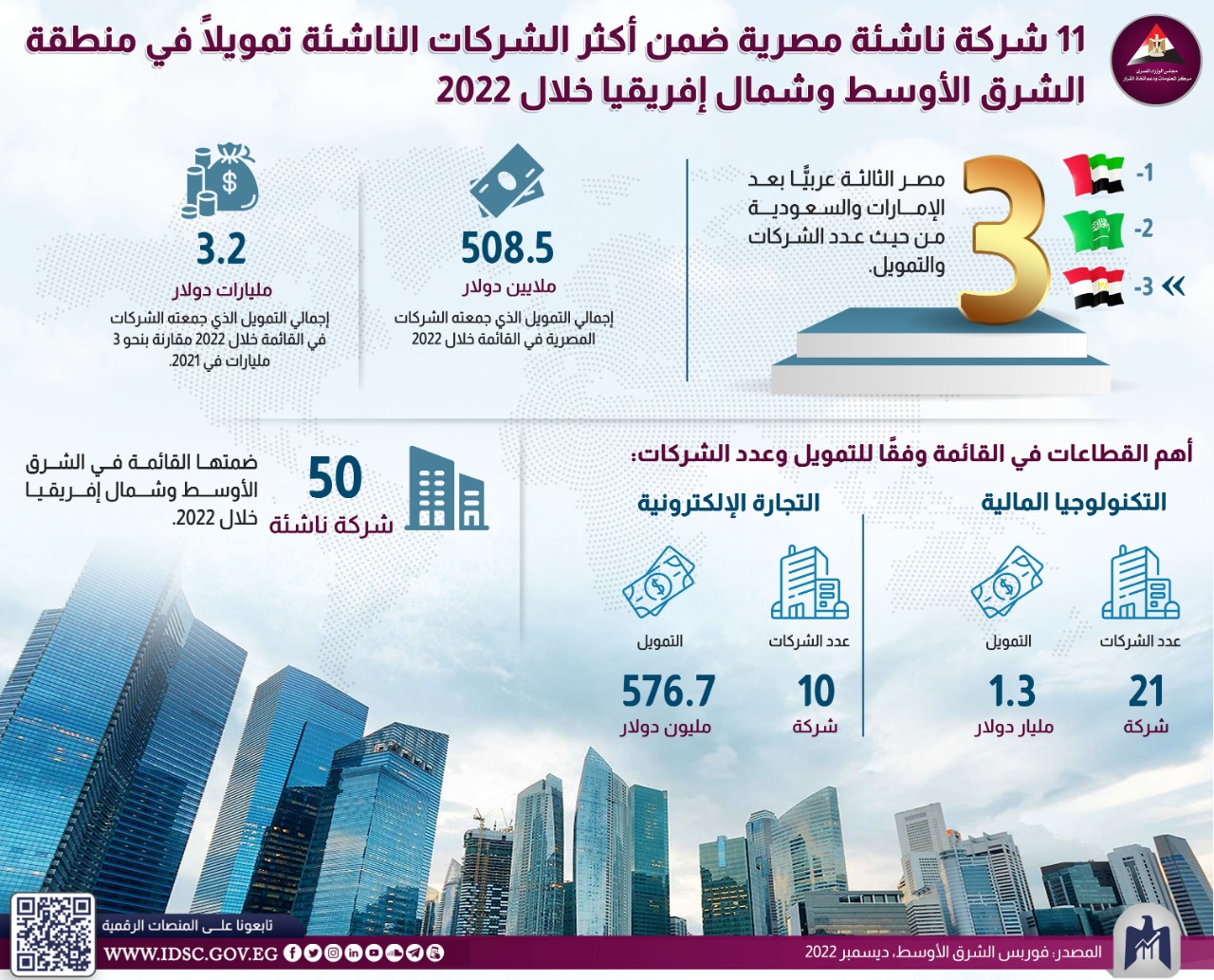 وأوضح مركز المعلومات لمجلس الوزراء المصري أن القائمة ضمت 50 شركة ناشئة في منطقة الشرق الأوسط وشمال إفريقيا استطاعت جمع 3.2 مليارات دولار خلال 2022 مقارنة بنحو 3 مليارات في 2021، وقد جاءت مصر في المرتبة الثالثة عربيًّا بعد الإمارات والسعودية من حيث عدد الشركات والتمويل.