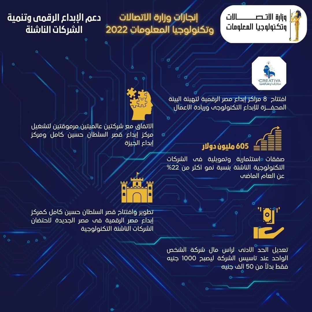 وأوضحت أن الرئيس عبد الفتاح السيسي افتتح خلال العام الماضي 8 مراكز إبداع مصر الرقمية فى كل من أسوان، وقنا، وسوهاج، والمنيا، والمنوفية، والإسماعيلية، والمنصورة، والقاهرة. وذلك فى إطار خطة تستهدف نشر مراكز إبداع مصر الرقمية فى كافة المحافظات لتهيئة البيئة المحفزة للإبداع التكنولوجى وريادة الأعمال من خلال زيادة عدد المراكز من 3 مراكز إلى 30 مركزا وذلك باستثمارات إجمالية تصل إلى 5 مليار جنيه.