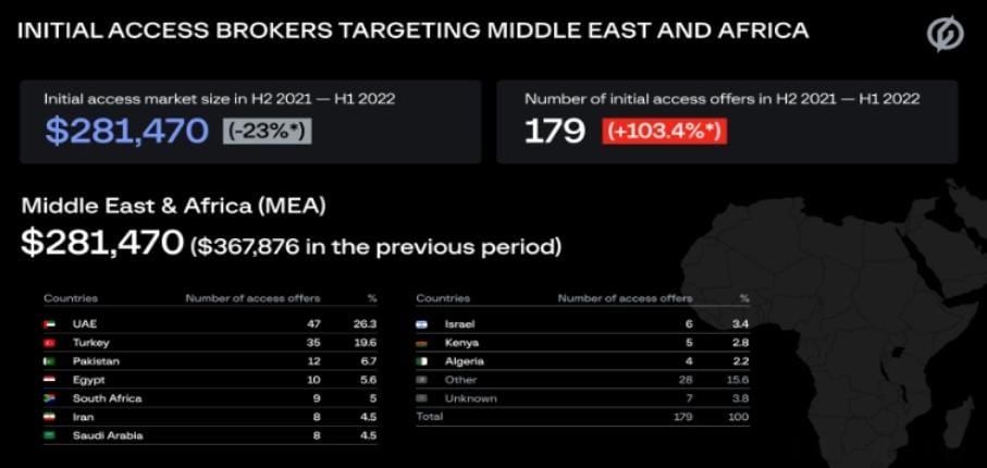 على مستوى منطقة الشرق الأوسط وإفريقيا، بقيت الشركات الإماراتية الأكثر استهدافاً والتي استحوذت على 26.3% من جميع عروض حالات الوصول إلى شبكات الشركات في المنطقة التي تم اكتشافها بين النصف الثاني من عام 2021 والنصف الأول من عام 2022، تلتها تركيا بواقع 19.6%، ثم باكستان بواقع 6.7%، ومصر بواقع 5.6%، وجنوب إفريقيا بواقع 5%، وإيران بواقع 4.5%، والمملكة العربية السعودية بواقع 4.5%، وكينيا بواقع 2.8% والجزائر بواقع 2.2%.