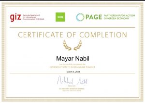 حصلت المحللة المالية والمصرفية ميار نبيل حسن على شهادة التمويل المستدام المقدمة من الأمم المتحدة بالتعاون مع الوكالة الألمانية للتعاون الدولي GIZ ومجموعة SBE.
