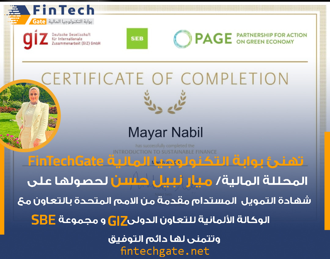 حصلت المحللة المالية والمصرفية ميار نبيل حسن على شهادة التمويل المستدام المقدمة من الأمم المتحدة بالتعاون مع الوكالة الألمانية للتعاون الدولي GIZ ومجموعة SBE.