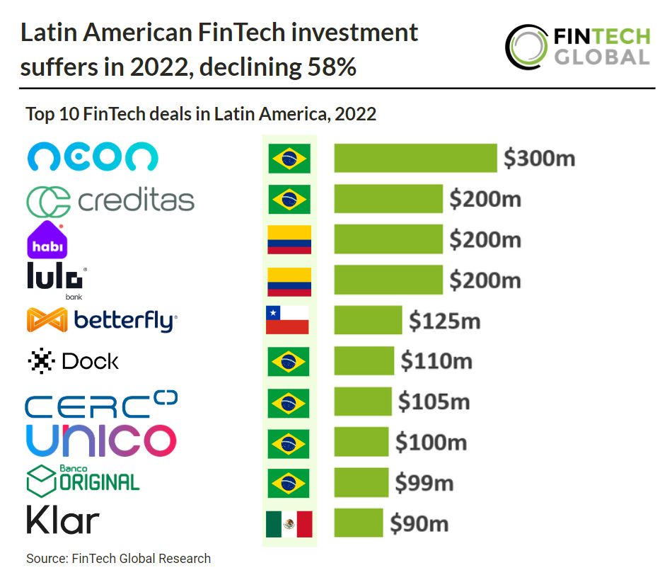 ورصدت فنتيك جلوبال أهم الصفقات في قطاع التكنولوجيا المالية في أمريكا اللاتينية، حيث تصدرت Neon البرازيلية، وهو بنك رقمي يقدم بطاقات الائتمان والقروض ، أكبر صفقات التمويل في القطاع خلال عام 2022 حيث جمع 300 مليون دولار في أحدث جولة تمويل من السلسلة D بقيادة BBVA .
