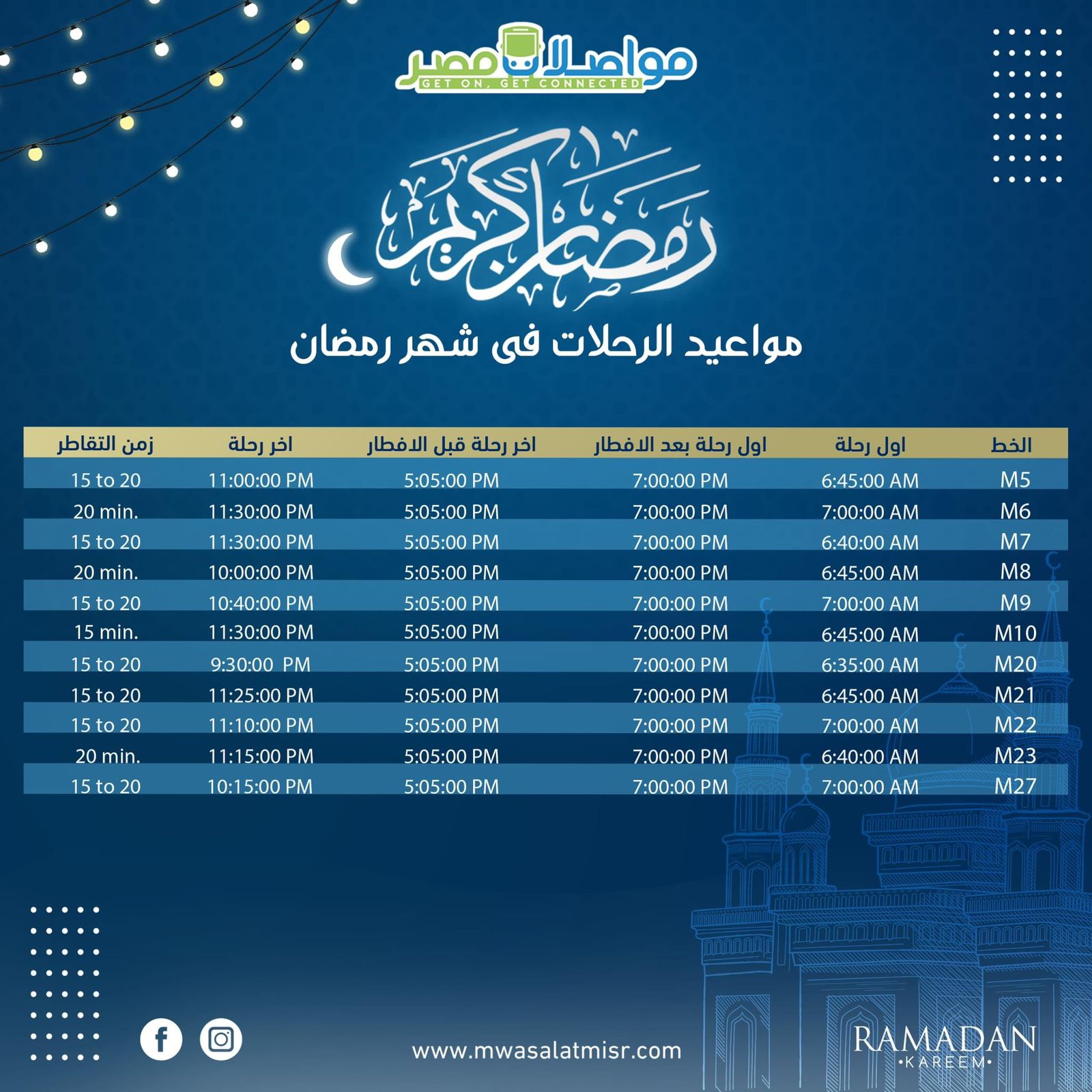 وأوضحت الشركة في بيان لها عن مواعيد آخر رحلة طول أيام شهر رمضان وهي في خط M5 في تمام 11 مساء، M6 وM7وM10 في تمام الساعة 11:30 مساء ، على أن تكون آخر رحلة لخط M8 في تمام العاشرة مساء، وM9 في تمام 10:40 مساء ، خط M20 في تمام 9:30 مساء ، وخط M21 في تمام11:25 مساء ، M22 في تمام 11:10 مساء ، M23 الساعة 11:15 مساء ، وبالنسبة لخط M27 تقلع فيه آخر رحلة في تمام 10:15 دقيقة.