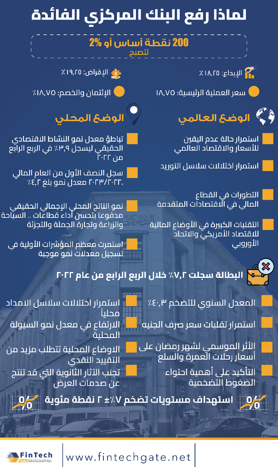 قررت لجنة السياسة النقديـة للبنك المركــزي المصـري في اجتماعهـا يــوم الخميس الموافـــق 30 مارس 2023 رفع سعري عائد الإيداع والإقراض لليلة واحدة وسعر العملية الرئيسية للبنك المركزي بواقع 200 نقطة أساس ليصل إلى 18.25%، 19.25% و18.75%، على الترتيب. كما تم رفع سعر الائتمان والخصم بواقع 200 نقطة أساس ليصل إلى 18.75%.