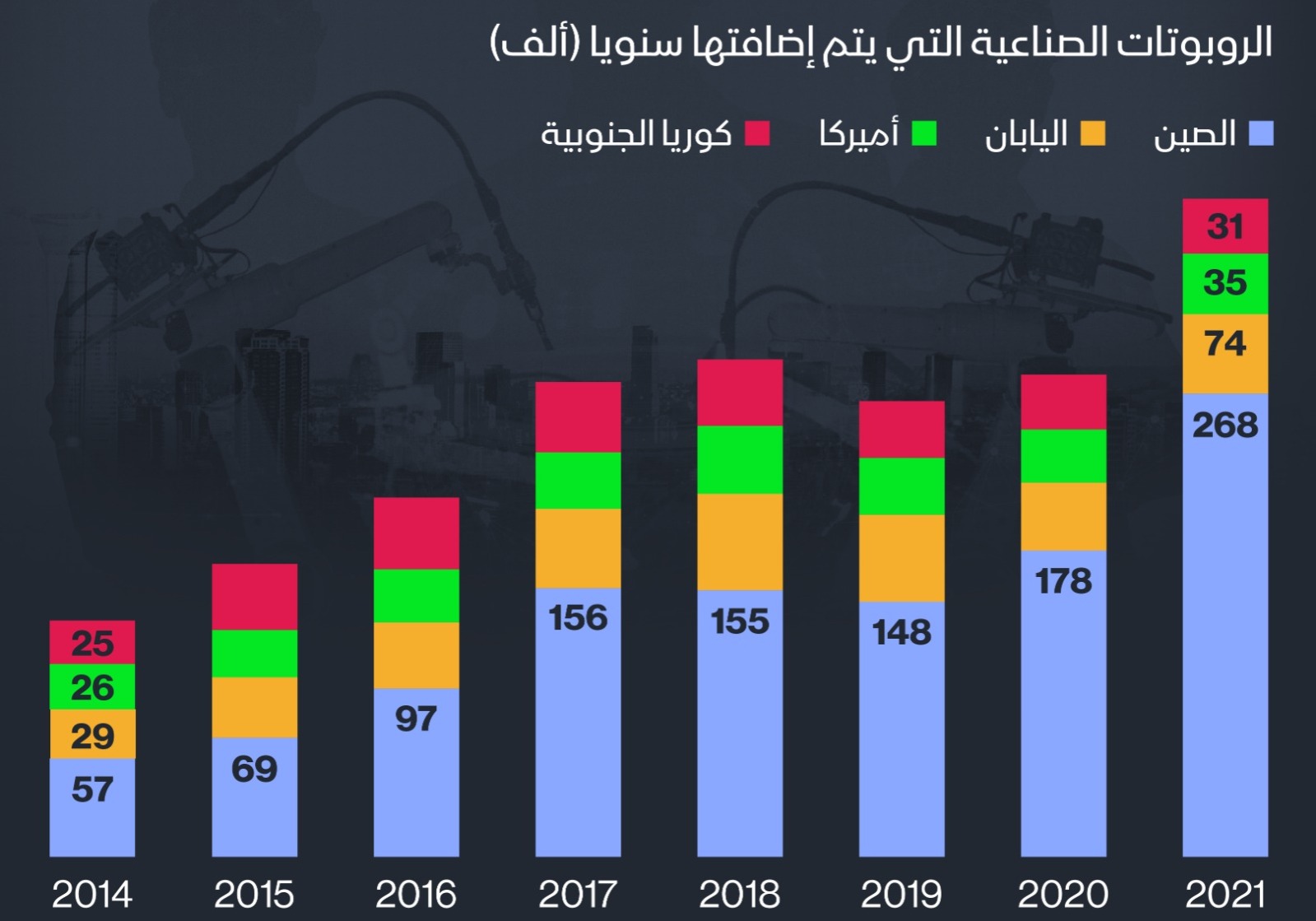 وذكر التقرير أن ذلك مقارنة مع 57 ألف روبوت للصين في 2014 و 59 ألف روبوت في اليابان و26 ألف روبوت في الولايات المتحدة و25 ألف روبوت في كوريا الجنوبية.