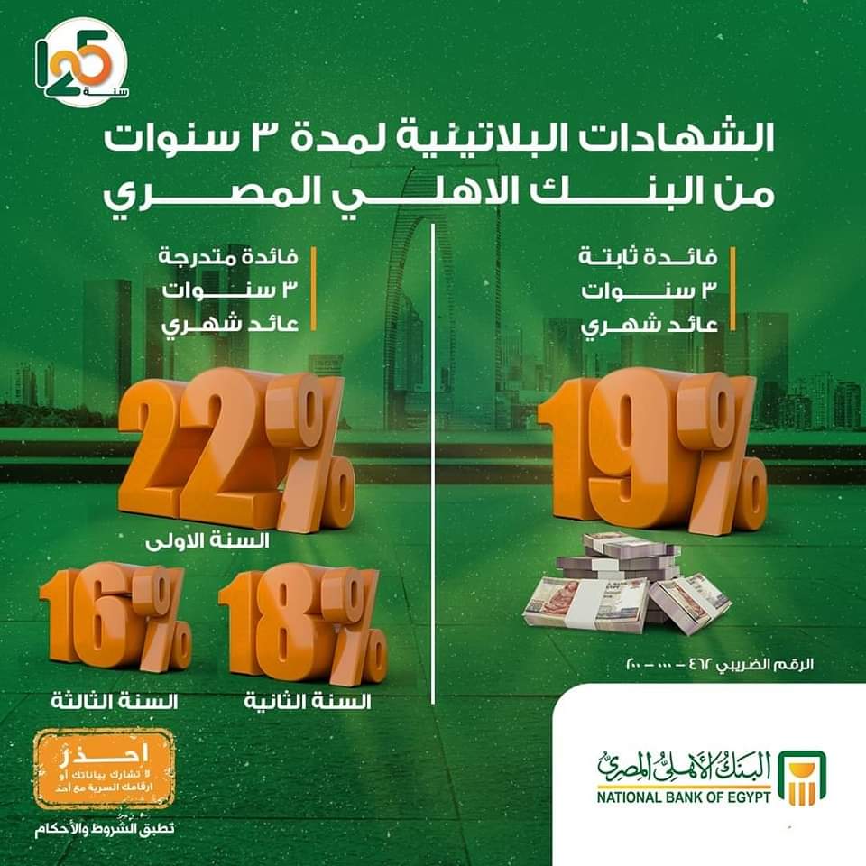 - بنكا “الأهلي” و”مصر” يطرحان شهادتين لأجل 3 سنوات بعائد 19% ثابت و22% متناقص