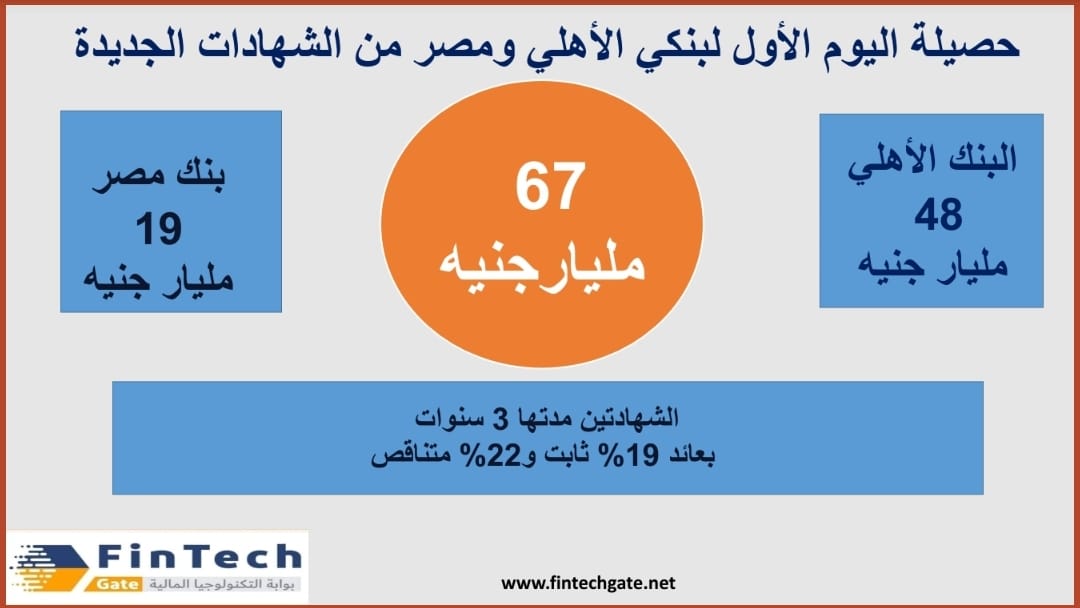 جمع بنكا الأهلي المصري ومصر حصيلة بقيمة 67 مليار جنيه من الشهادات الجديدة خلال يوم واحد فقط من طرحها، بواقع 48 مليار جنيه للأهلي و19 مليار جنيه لبنك مصر.