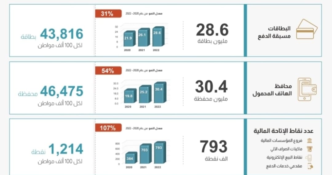 وأضاف أن متوسط عدد بطاقات الدفع المسبق بلغ 43 ألف و816 ألف محفظة لكل 100 ألف مواطن خلال الفترة من 2020 إلى 2022.