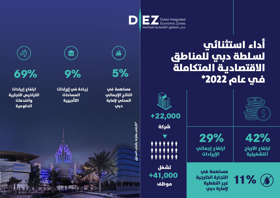 سجلت سلطة دبي للمناطق الاقتصادية المتكاملة “دييز” قفزة نوعية في نتائج أرباحها التشغيلية لعام 2022، والتي بلغت 42% في حين ارتفع إجمالي الإيرادات بنسبة 29% مقارنة بعام 2021.