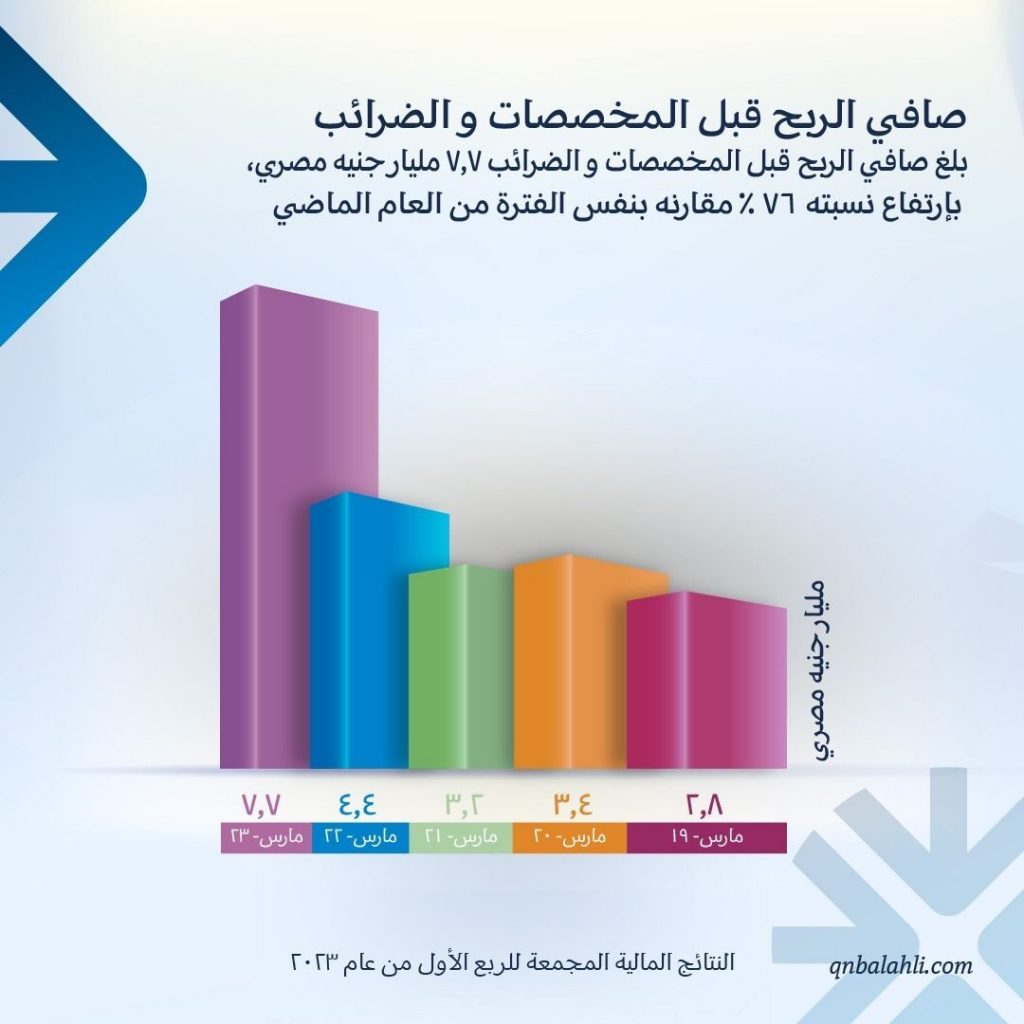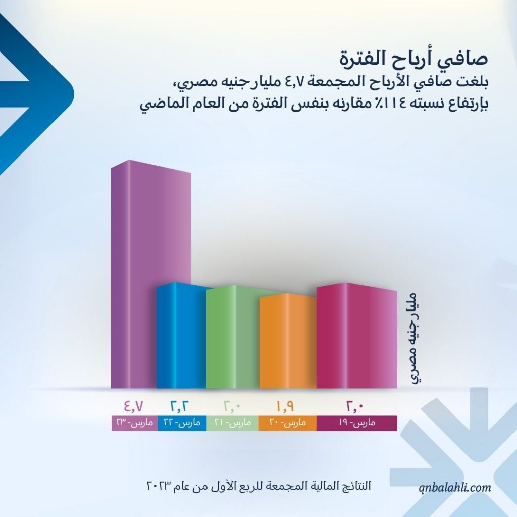 أعلن بنك QNB الأهلي عن تحقيق صافي أرباح مجمعة بلغت 4,715 مليار جنيه ، بزيادة قدرها 2,507 مليار جنيه بنسبة نمو بلغت 114% مقارنة بنفس الفترة في 2022، بينما بلغت صافي أرباح البنك المستقلة 4,481 مليار جنيه.
