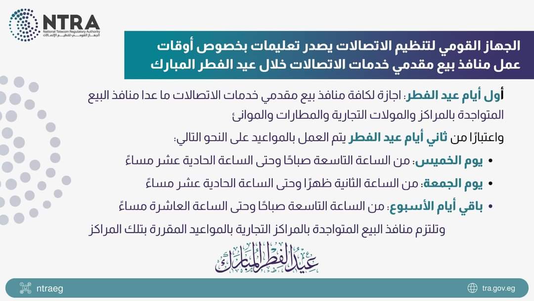 أصدر الجهاز القومي لتنظيم الاتصالات تعليمات بخصوص أوقات عمل منافذ بيع مقدمي خدمات الاتصالات والأوقات الخاصة بالتعامل مع الجمهور خلال فترة عيد الفطر المبارك.