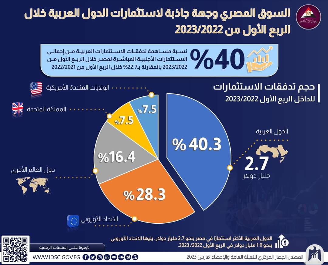 ارتفعت نسبة مساهمة تدفقات الاستثمارات العربية لمصر من إجمالي الاستثمارات الأجنبية المباشرة لمصر) خلال الربع الأول من 2023/2022 لتبلغ 40.3% مقارنة بنحو 22.7% خلال الربع الأول من 2022/2021.