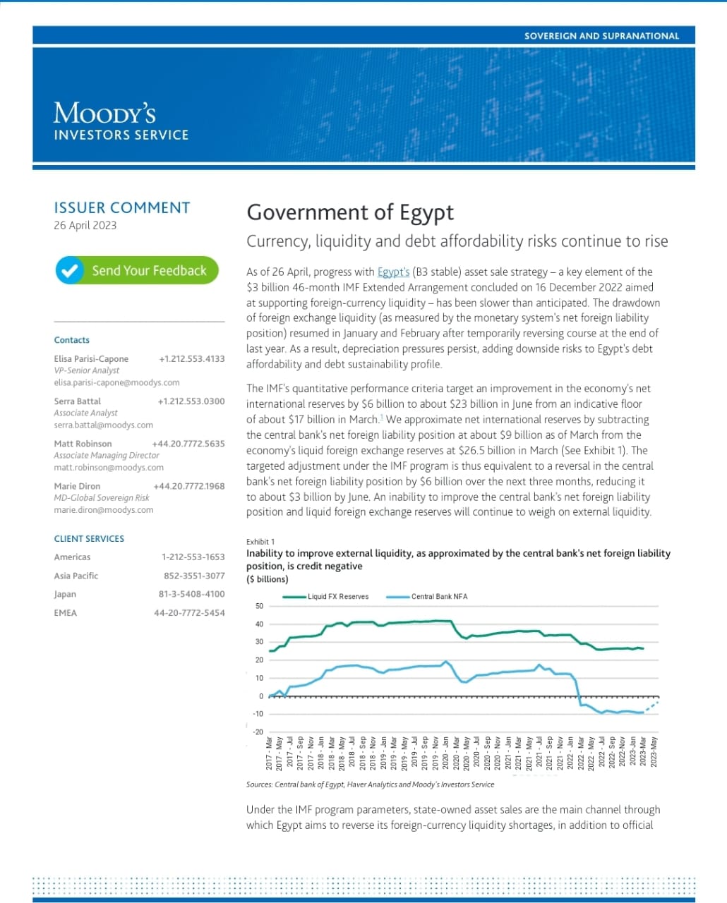 قالت وكالة “موديز” للتصنيف الائتماني إن استراتيجية مصر في بيع الأصول، التي تمثل مطلبا رئيسيا لاستكمال تمويل صندوق النقد للبلاد، تسير بوتيرة أبطأ من التوقعات ما يؤثر سلبا على سيولة العملات الأجنبية.