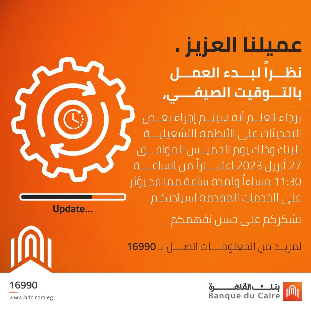 أعلن بنك القاهرة عن قيامه باجراء بعض التحديثات على أنظمة البنك التشغيلية مساء اليوم الخميس اعتبارا من الساعة 11.30 مساء لمدة ساعة وذلك بسبب العمل بنظام التوقيت الصيفي.