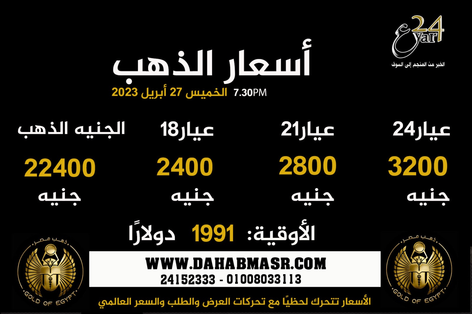 ووفق موقع ذهب مصر سجل سعر الذهب عيار 21 -الاكثر مبيعا 2800 جنيه ،فيما سجل الذهب عيار 18 نحو 2400 جنيه،وسجل سعر عيار 24 نحو 3200 جنيه، وسجل سعر جنيه الذهب نحو 22.400 ألف جنيه بدون مصنعية وضريبة الدمغة،فيما بلغ سعر الأوقية 1991 دولارا.