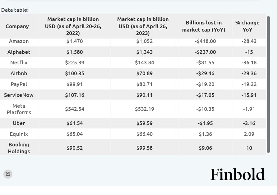 وتراجعت القيمة السوقية لشركة Airbnb بنسبة 29.36%، إلى 70.89 مليار دولار من 100.35 مليار دولار مسجلو في أبريل من السنة الماضية، كما خسرت شركة أمازون، ثاني أكبر شركة إنترنت أميركية من حيث القيمة، بنسبة 28.43% من قيمتها السوقية لتسجل 1.05 تريليون دولار من 1.74 تريليون دولار قبل سنة.