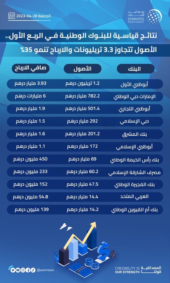 زادت أصول /موجودات/ 12 بنكاً وطنياً مدرجاً إلى 3 تريليونات و339 مليارا و517 مليون درهم (قرابة تريليون دولار) بنهاية الربع الأول من العام الجاري، بما يعكس قوة ملاءتها المالية مستفيدة من انتعاش الاقتصاد الوطني وذلك بالرغم من التحديات التي شهدها القطاع المصرفي العالمي.