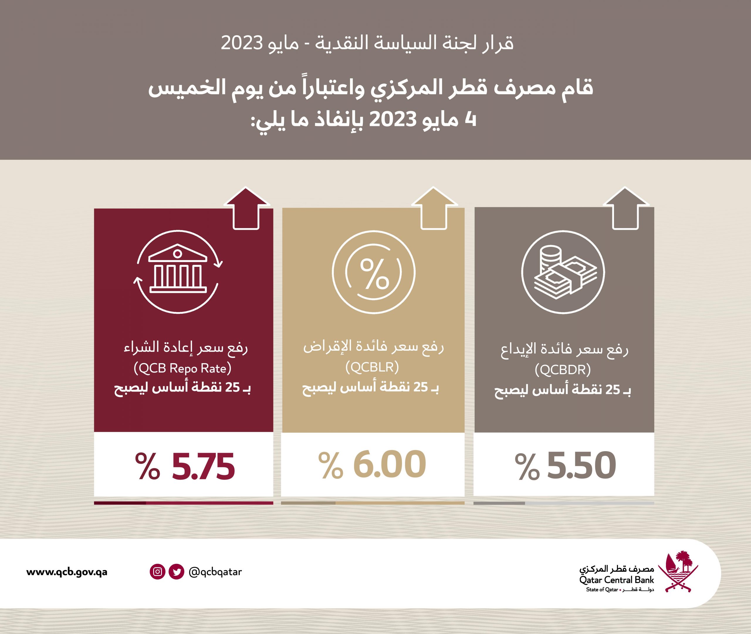 ورفع مصرف قطر المركزي أسعار فائدة الإيداع والإقراض وإعادة الشراء بمقدار 25 نقطة أساس او ربع نقطة مئوية، ليرتفع سعر فائدة الايداع إلى 5.5%، وسعر فائدة الإقراض إلى 6%، وسعر إعادة الشراء إلي 5.75%.