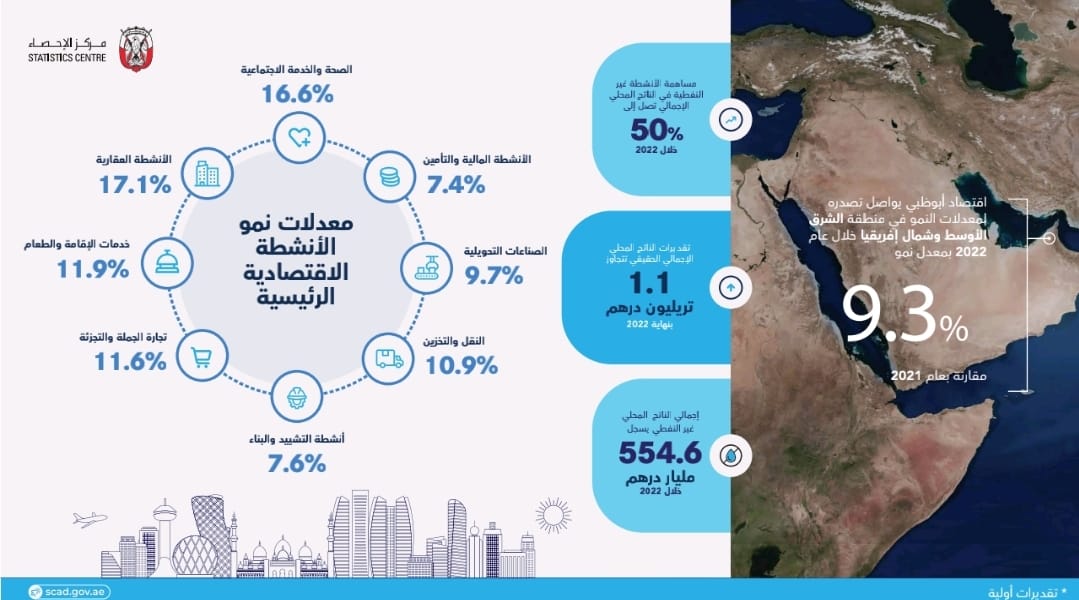أصدر مركز الإحصاء – أبوظبي تقديرات الناتج المحلي الإجمالي لإمارة أبوظبي والتي أظهرت نموًا بنسبة 9.3% خلال عام 2022 مقارنة بعام 2021، مواصلاً تصدره معدلات النمو بمنطقة الشرق الأوسط وشمال إفريقيا.