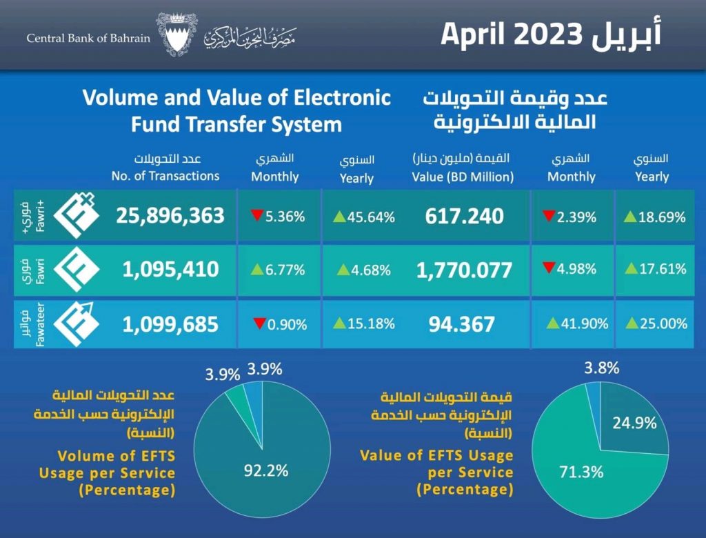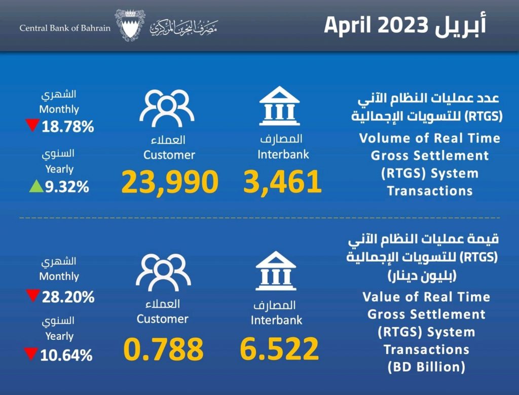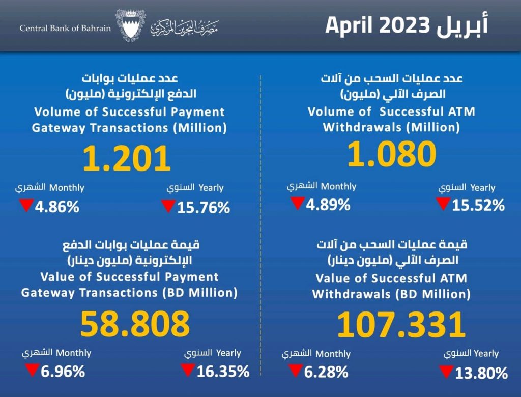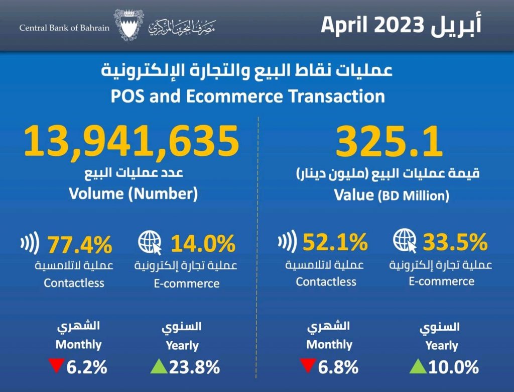 أعلن مصرف البحرين المركزي أن عدد عمليات البيع خلال شهر إبريل الماضي، بلغت 13.941 مليون عملية، بتراجع شهري بلغ 6.2%و نمو سنوي 23.8%
