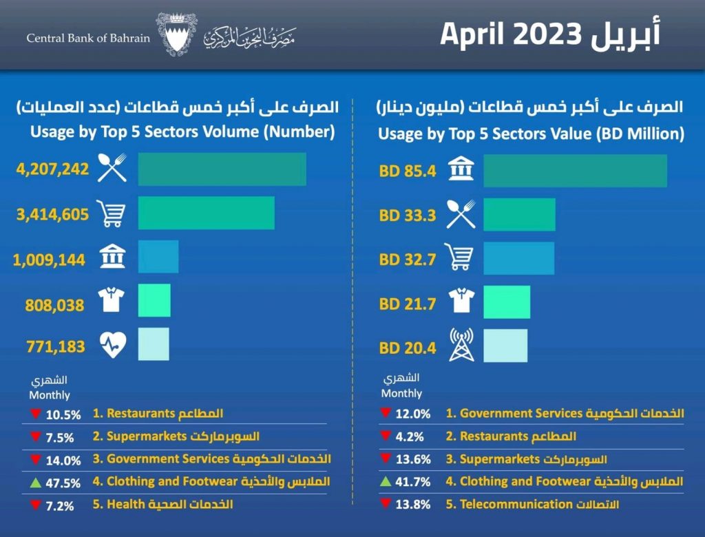 ووفقًا لأحدث لإحصاءات عمليات نقاط البيع وأنظمة المدفوعات في أبريل 2023 الصادرة عن مصرف البحرين المركزي، فإن أكبر 5 قطاعات من حيث قيمة الصرف عليها كانت كالتالي: