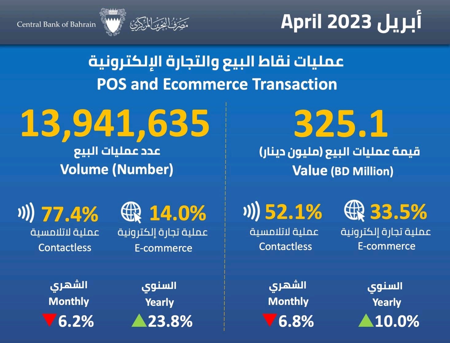 أعلن مصرف البحرين المركزي أن عدد عمليات البيع خلال شهر إبريل الماضي، بلغت 13.941 مليون عملية، بتراجع شهري بلغ 6.2%و نمو سنوي 23.8%
