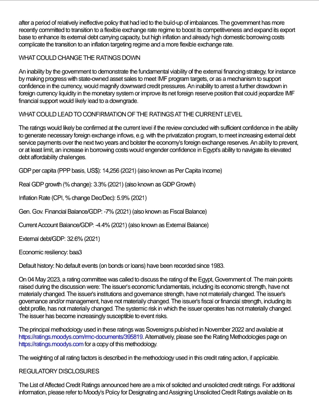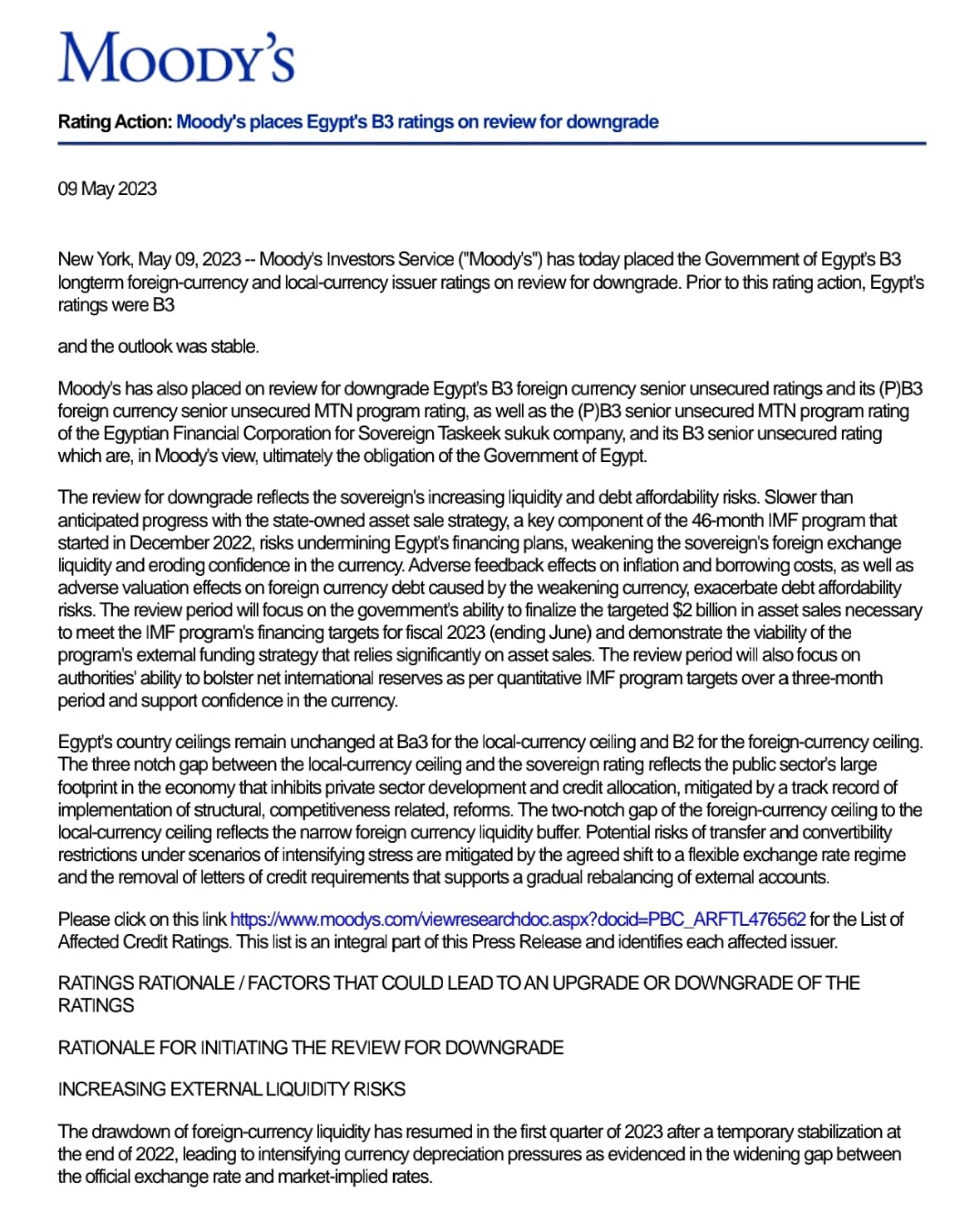 - «موديز» تضع التصنيف الائتماني لمصر قيد المراجعة