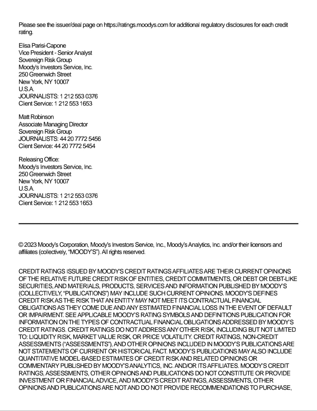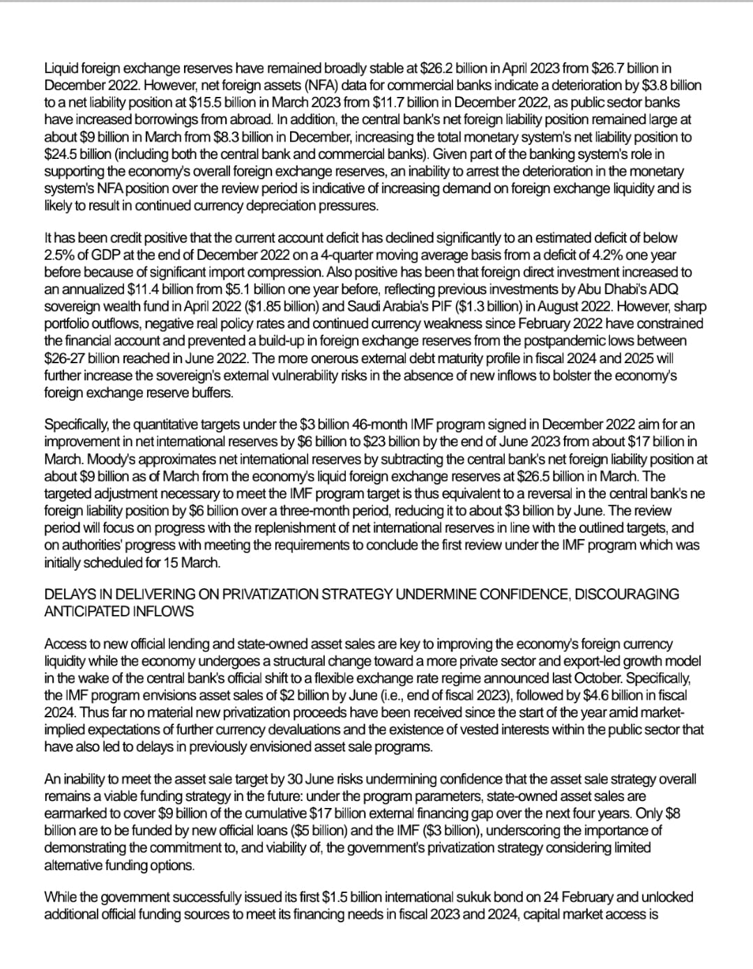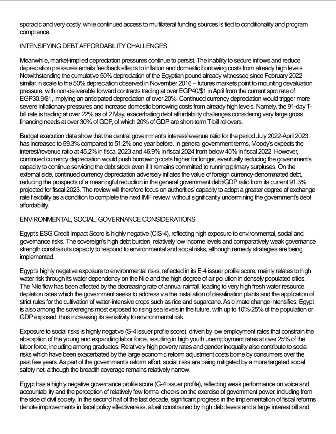 The review for downgrade reflects the sovereign’s increasing liquidity and debt affordability risks. Slower than anticipated progress with the state-owned asset sale strategy, a key component of the 46-month IMF program that started in December 2022, risks undermining Egypt’s financing plans, weakening the sovereign’s foreign exchange liquidity and eroding confidence in the currency. Adverse feedback effects on inflation and borrowing costs, as well as adverse valuation effects on foreign currency debt caused by the weakening currency, exacerbate debt affordability risks. The review period will focus on the government’s ability to finalize the targeted $2 billion in asset sales necessary to meet the IMF program’s financing targets for fiscal 2023 (ending June) and demonstrate the viability of the program’s external funding strategy that relies significantly on asset sales. The review period will also focus on authorities’ ability to bolster net international reserves as per quantitative IMF program targets over a three-month period and support confidence in the currency.