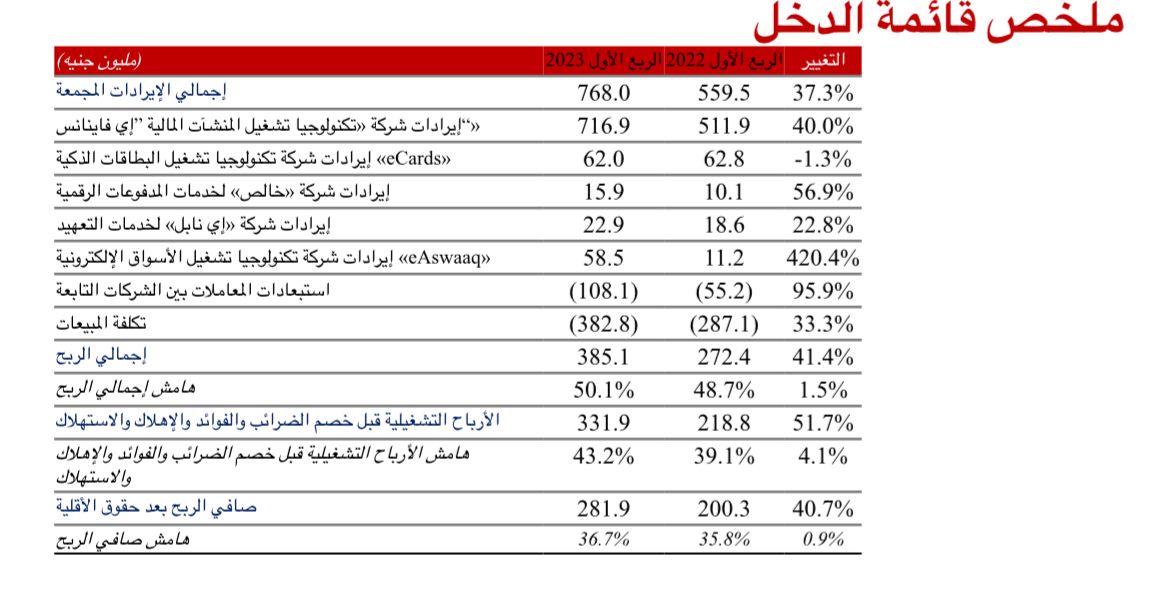 ارتفعت الإيرادات بمعدل سنوي 37.3% لتبلغ 768.0 مليون جنيه خلال عام الربع الأول من عام 2023. ويرجع هذا النمو القوي بصورة أساسية إلى الأداء المتميز لشركة تكنولوجيا تشغيل المنشآت المالية» إي فاينانس «وتكنولوجيا تشغيل الأسواق الإلكترونية «eAswaaq» وشركة «خالص» لخدمات المدفوعات الرقمية خلال نفس الفترة.