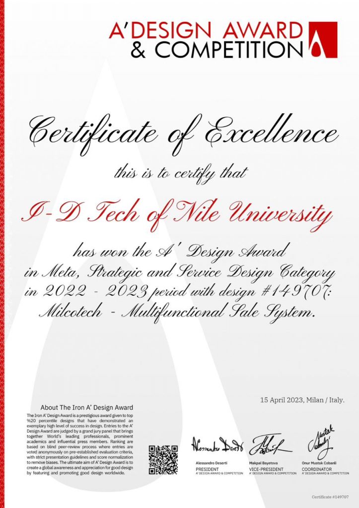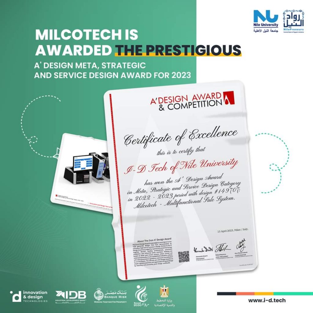 حصلت مبادرة رواد النيل إحدى مبادرات البنك المركزي المصري وتنفذها جامعة النيل الأهلية بالتعاون مع عدد من الجهات والبنوك، على جائزة مؤسسة «A’ Design Award» العالمية، في مجال التصميمات الهندسية عن تصميم جهاز «Milcotech» الذي يعمل على تسهيل جمع وقياس جودة الألبان التي يتم جمعها من المزارعين من خلال عملية مميكنة وميسرة.