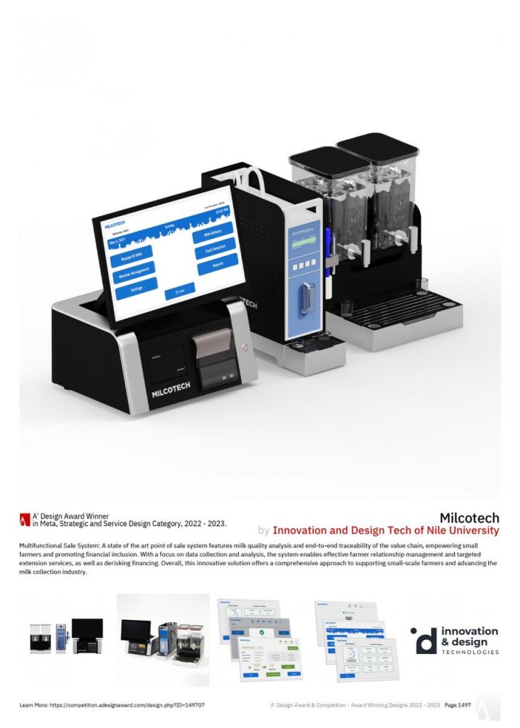 وأضافت لبيب أن جهاز«Milcotech» الذي صممه مركز الإبتكار والتصميم بمبادرة رواد النيل يعمل على قيام المزارعين بتسليم الألبان إلى «مركز التجميع» واستخراج بطاقة «RFID» الإلكترونية خاصة به لتضم كافة بياناته وحساباته، حيث يقوم الجهاز بوزن الألبان وإختبار جودتها وتسجيل البيانات اللازمة الخاصة بإسم المزارع والكمية وقيمتها وإضافتها إلى حسابه على البطاقة، كما يمكن للجهاز رفض الألبان إذا ما كانت غير صالحة.