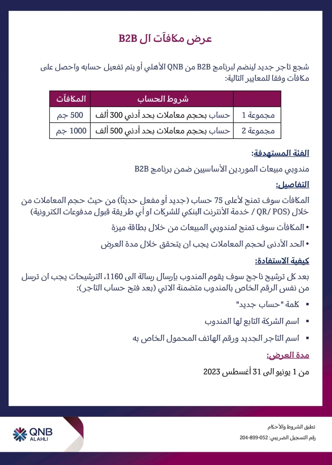 أعلن بنك QNB الأهلي عن استفادة مندوبي مبيعات الموردين الأساسيين من المكافآت المقدمة من البنك، وذلك من خلال تفعيل حساب او ضم تجار جدد لبرنامج B2B التابع له في الفترة من أول يونيو وحتى 31 أغسطس المقبل.