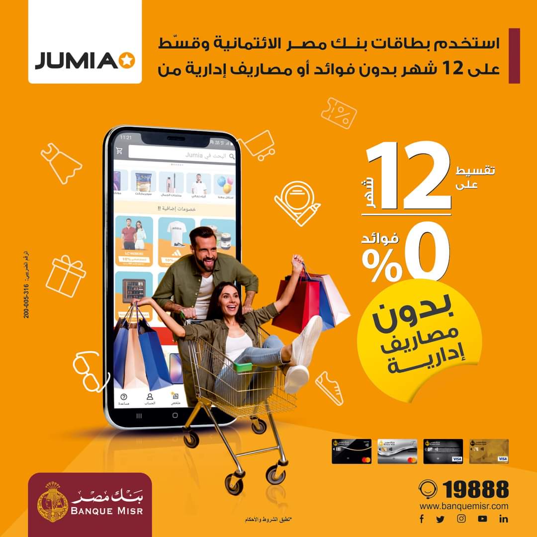 أعلن بنك مصر لعملائه إتاحة تقسيط مشترياتهم من جوميا حتى 12 شهرا بدون فوائد وبدون مصاريف إدارية.